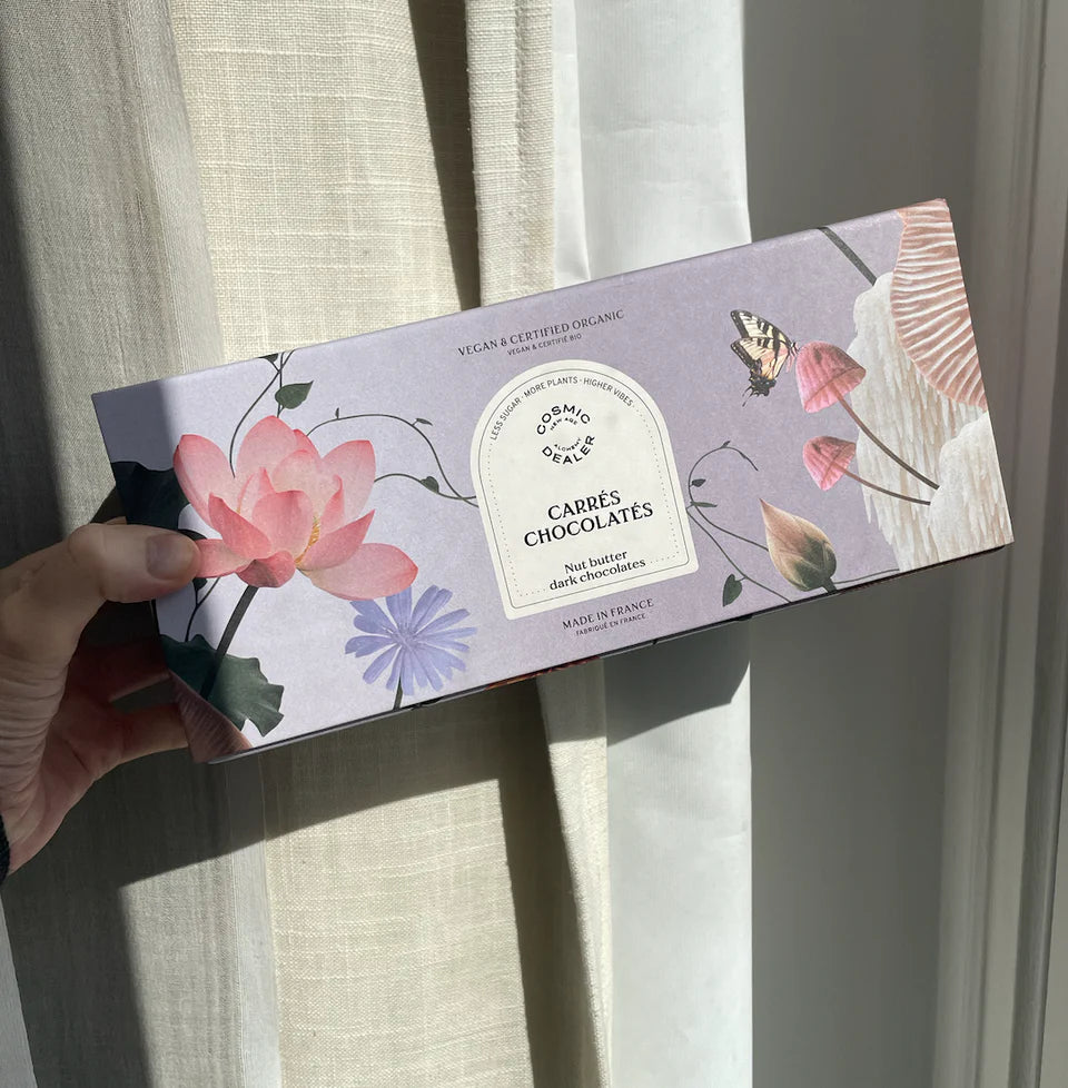 Un assortiment de carrés de beurre de noix et de graines saines, microdosés de plantes fonctionnelles et tout ça enrobés de chocolat noir crus ! Ces chocolats ne sont pas justes délicieux, ils font beaucoup plus, avec maximum 2gr de sucres par chakra provenant des dattes !