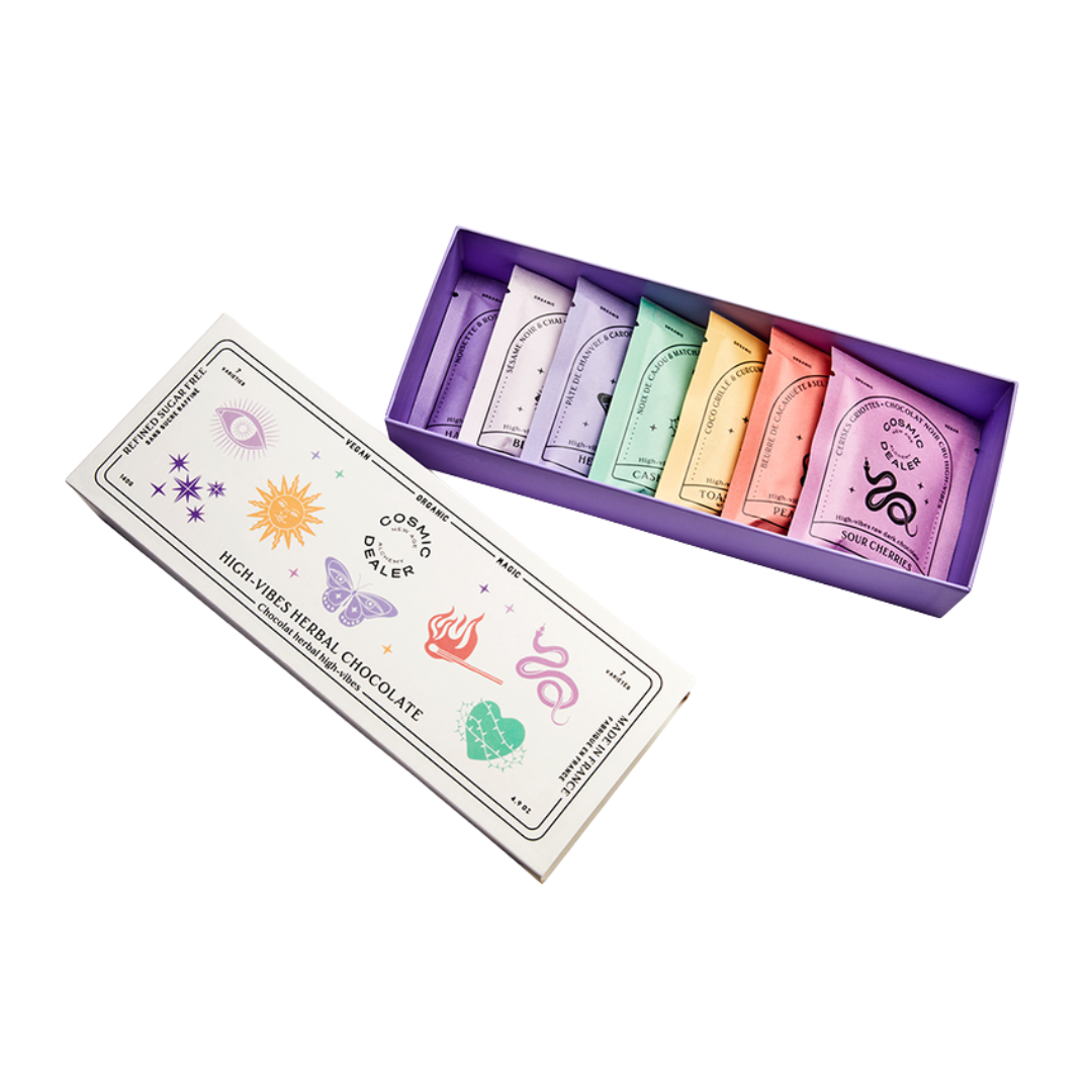 Un assortiment de carrés de beurre de noix et de graines saines, microdosés de plantes fonctionnelles et tout ça enrobés de chocolat noir crus ! Ces chocolats ne sont pas justes délicieux, ils font beaucoup plus, avec maximum 2gr de sucres par chakra provenant des dattes !