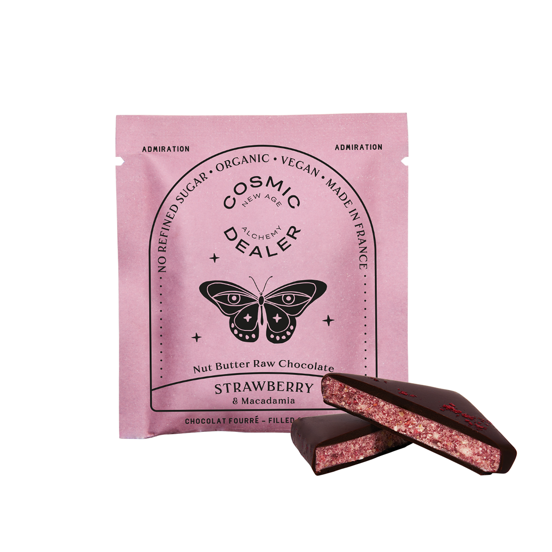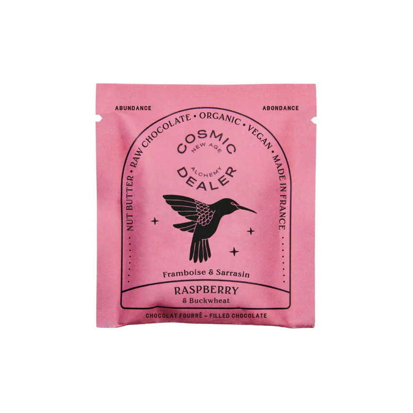Ingrédients : Purée de macadamia*, Chocolat noir cru 75% (fèves de cacao non torréfiées, dattes)*, Beurre de cacao cru*, Poudre de framboise (5%)*, Dattes*,Sarrasin(2%)*