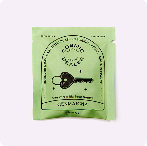 Ingrédients : Purée d'amande blanchie, chocolat noir à 75% cru (fèves de cacao, dattes), beurre de cacao cru , Genmaicha (thé vert, riz brun soufflé), dattes.