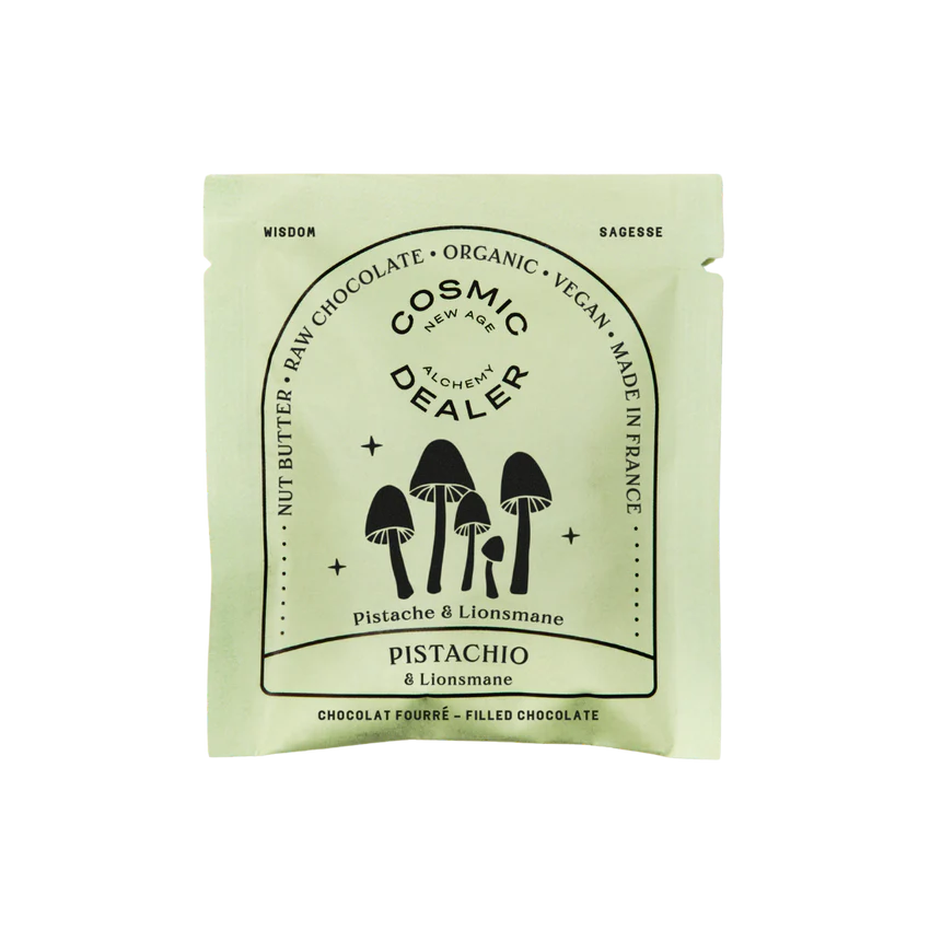 Ingrédients : Chocolat noir cru 75% (fèves de cacao non torréfiées, dattes)*, Purée depistache(23%)*, Purée d'amande, Beurre de cacao cru*,Pistaches(8%)*, Poudre de Lionsmane (3%)*, Sel