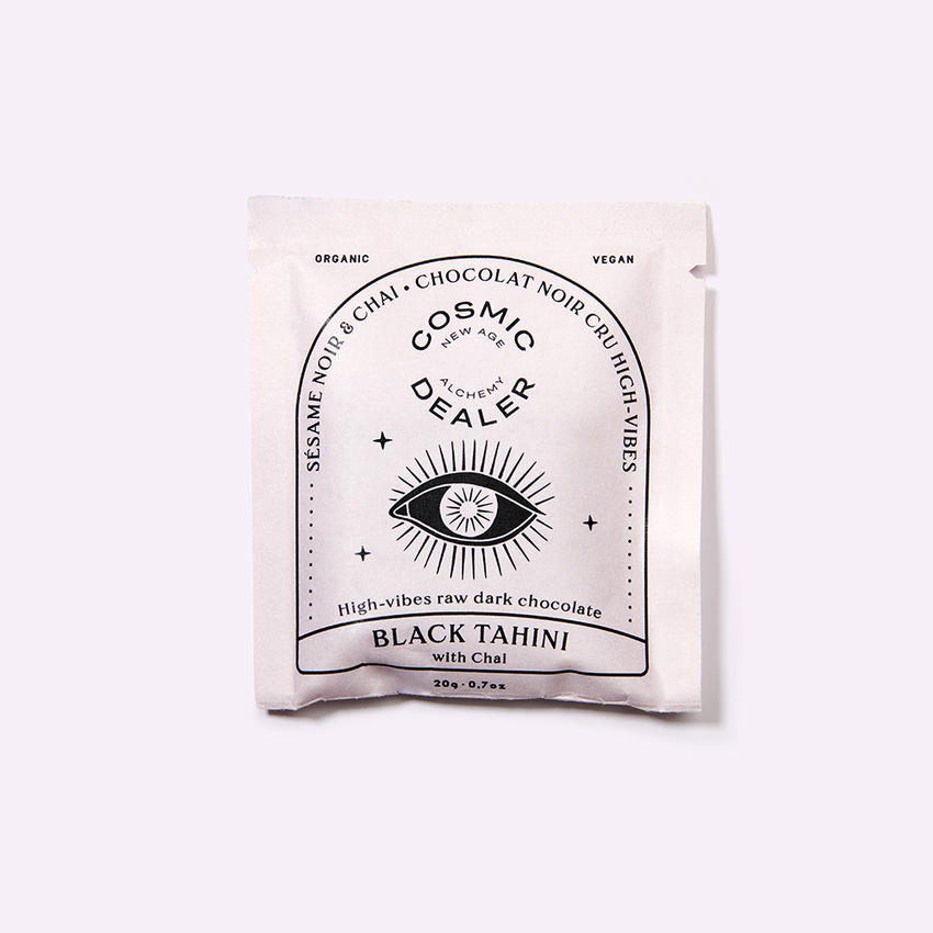 Ingrédients: Black sesame paste, 75% Dark raw chocolate (cacao beans, dates), Raw cocoa butter, Sesame seeds, Date syrup, Chai spices (coriander, fenugreek, cardamom, rose, nutmeg, ginger, pepper, cloves, cinnamon)