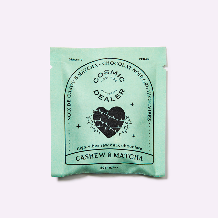 Ingrédients: Cashew nut puree, 75% Dark raw chocolate (cacao beans, dates), Raw cocoa butter, Cashew nuts, Matcha tea