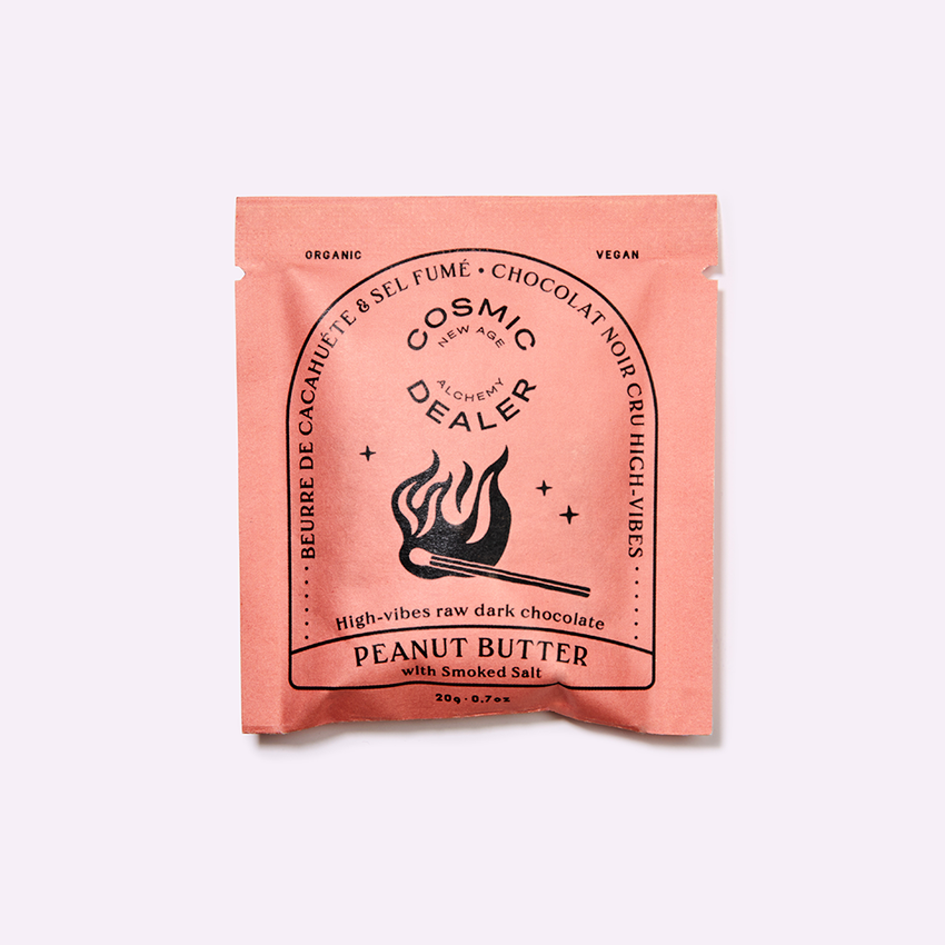Ingrédients: Peanut puree, 75% Dark raw chocolate (cacao beans, dates), Smoked salt.