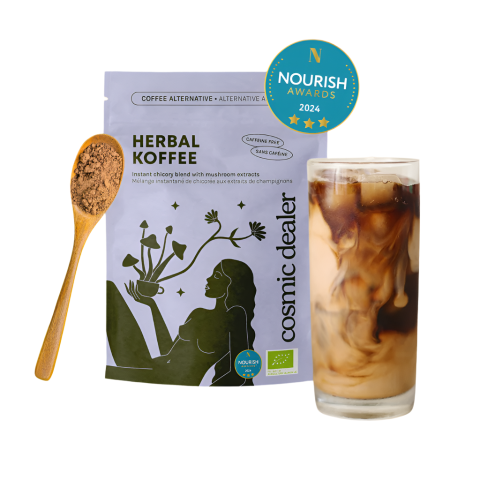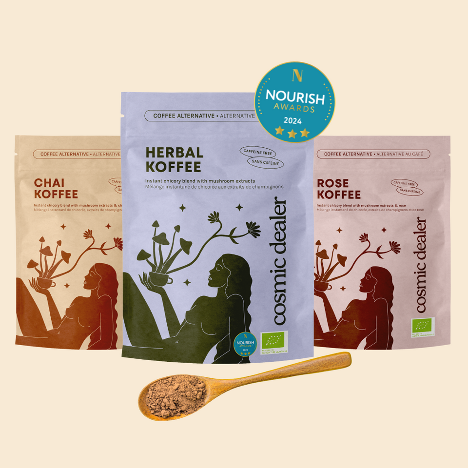 Une poudre instantanée de chicorée enrichie de 360 g d'extraits de champignons bio de Crinière de Lion, de Reishi et de Maitake par portion.