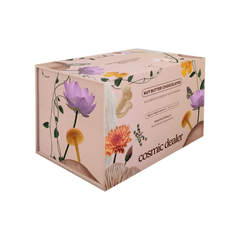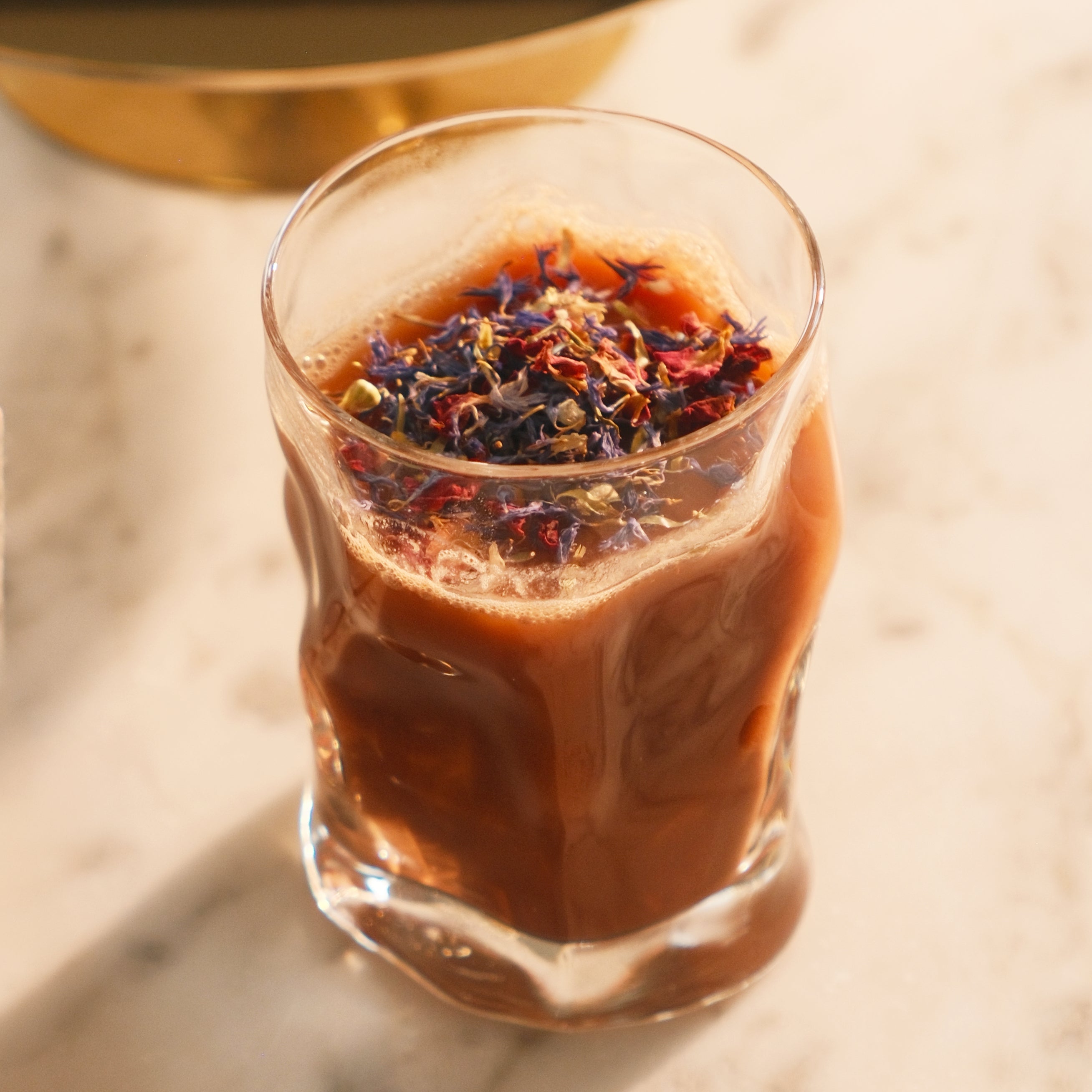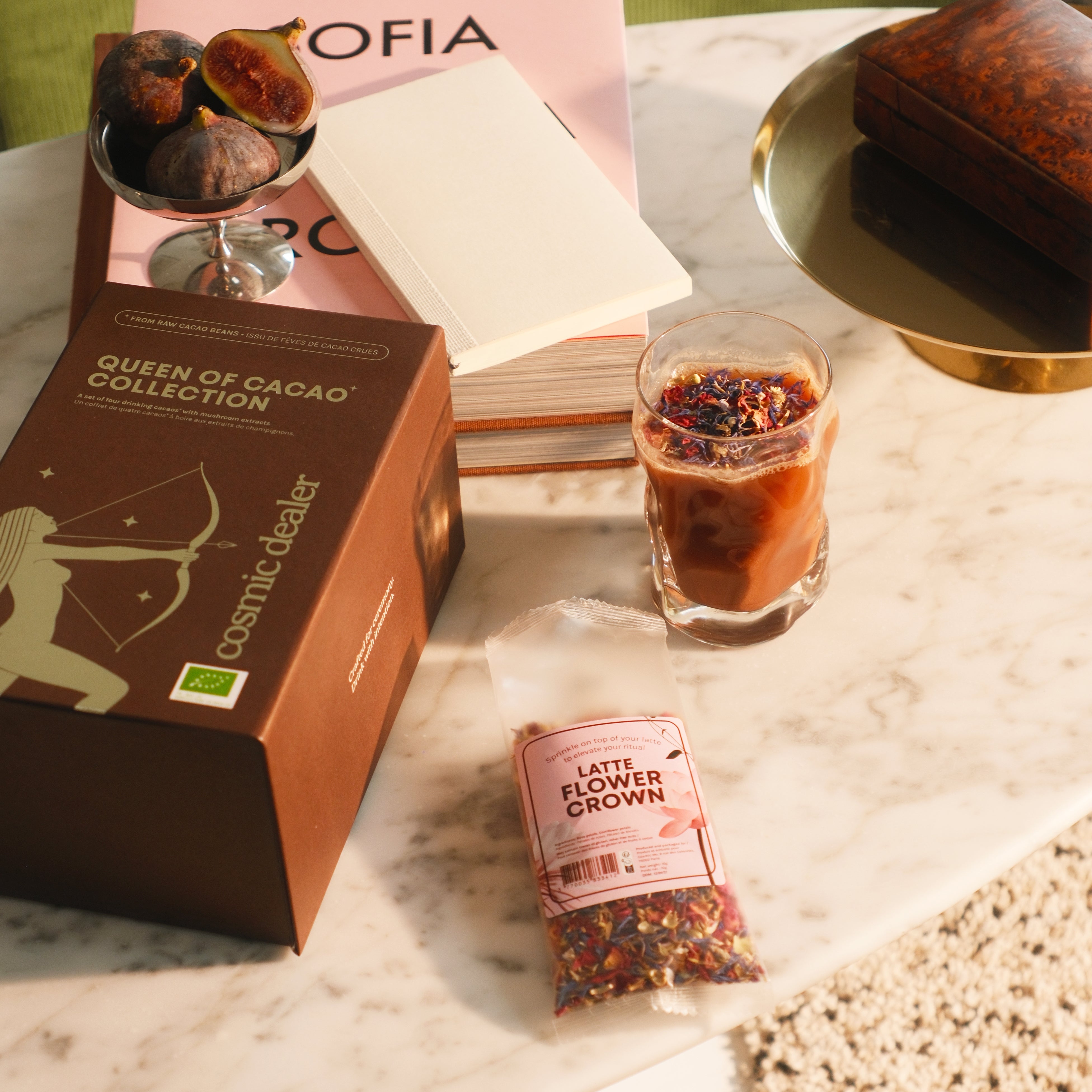 Ce coffret cadeau comprend aussi un sachet de pétales de fleurs comestibles — à saupoudrer sur le dessus pour créer une couronne de fleurs pour votre cacao, et une carte rituelle avec des méditations à écouter pendant que vous dégustez chaque mélange de cacao.