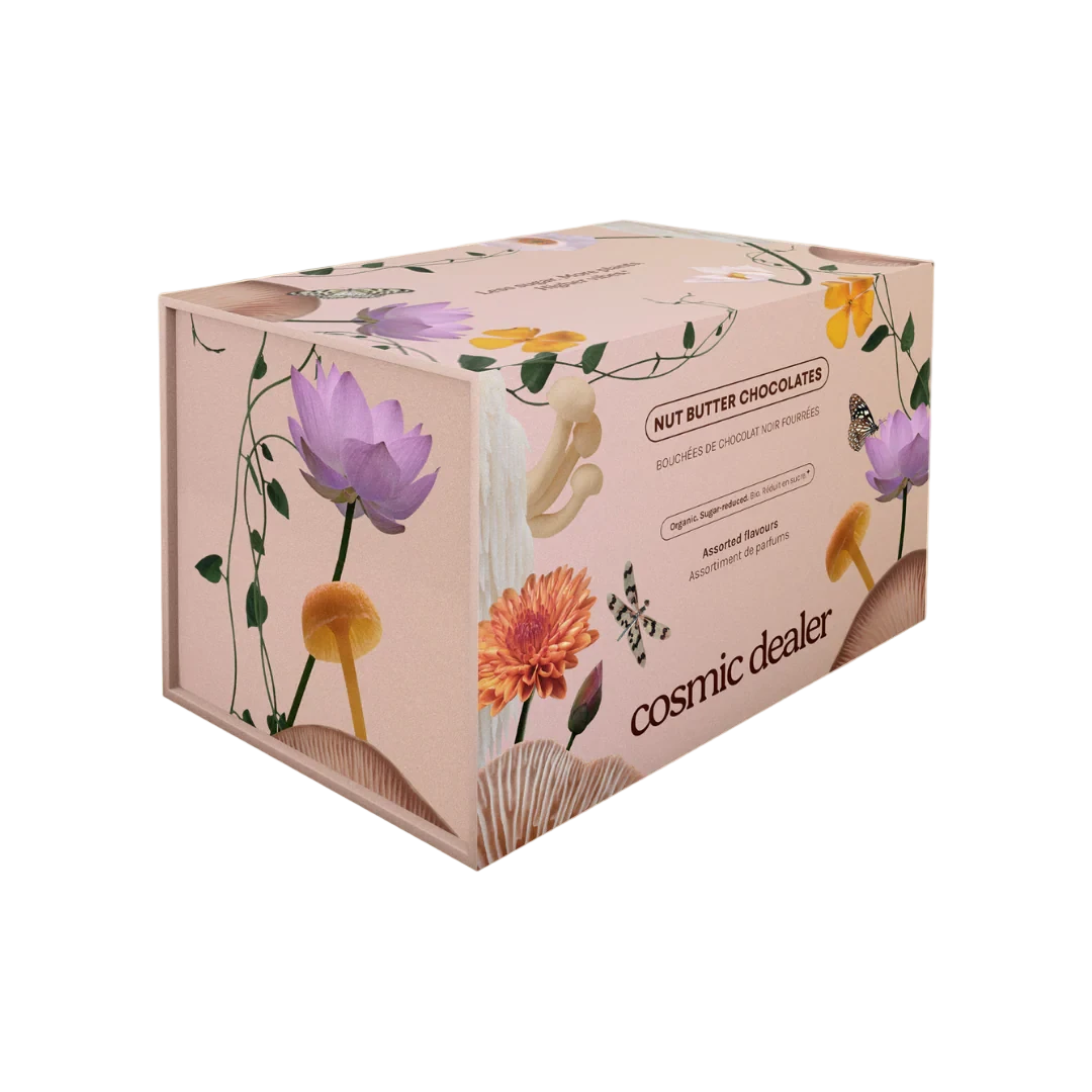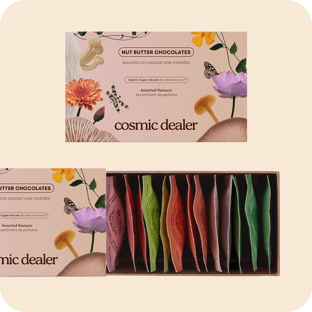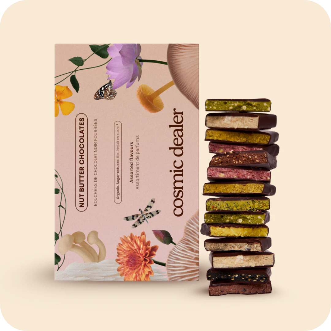Un assortiment de carrés de beurre de noix et de graines saines, microdosés de plantes fonctionnelles et tout ça enrobés de chocolat noir crus ! Ces chocolats ne sont pas justes délicieux, ils font beaucoup plus, avec maximum 2gr de sucres par chakra provenant des dattes !