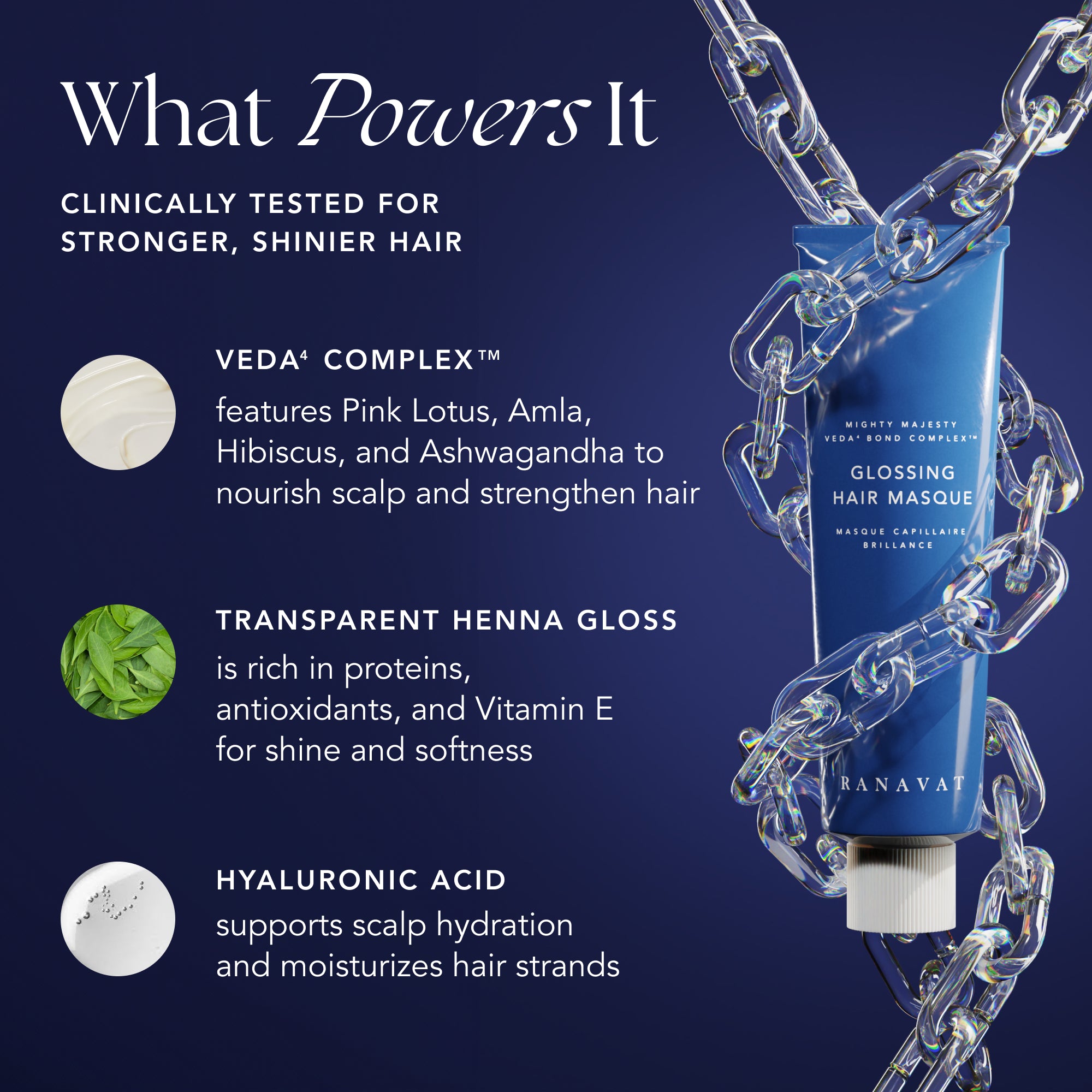 - Henné transparent gloss : particulièrement riche en vitamine E, en protéines et en antioxydants, il adoucit et apporte de la brillance au cheveux tout en maintenant le cuir chevelu hydraté et équilibré.