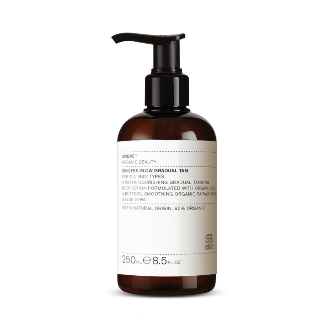 Sunless Glow de la marque Evolve Beauty est une lotion autobronzante donnant à la peau un bronzage progressif sur plusieurs applications.