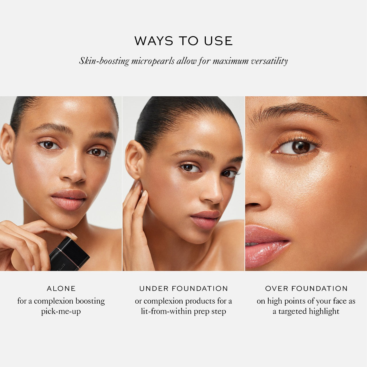 - Vitamine C : uniformise et ravive l'éclat du teint, diminue l'aspect des tâches pigmentaires et protège du stress oxydatif des cellules.