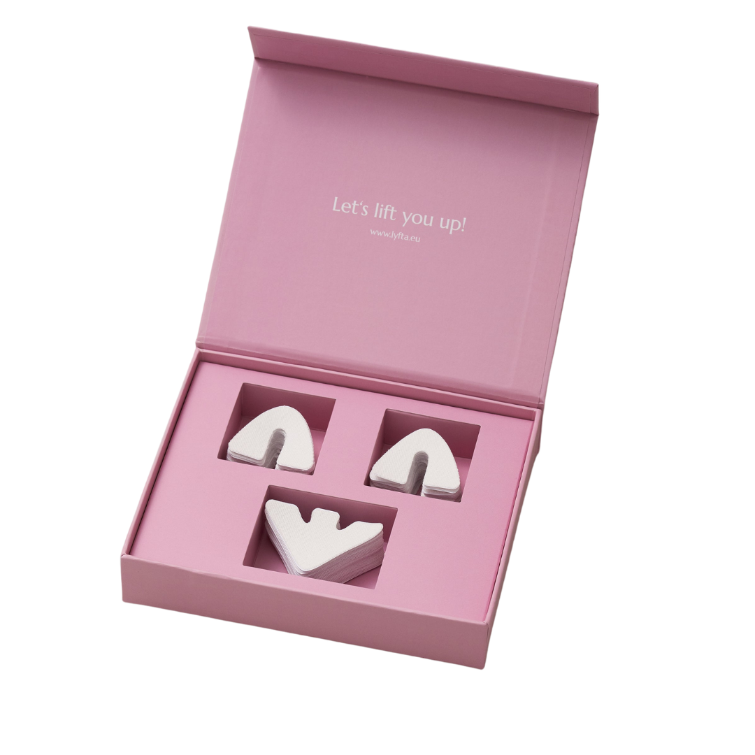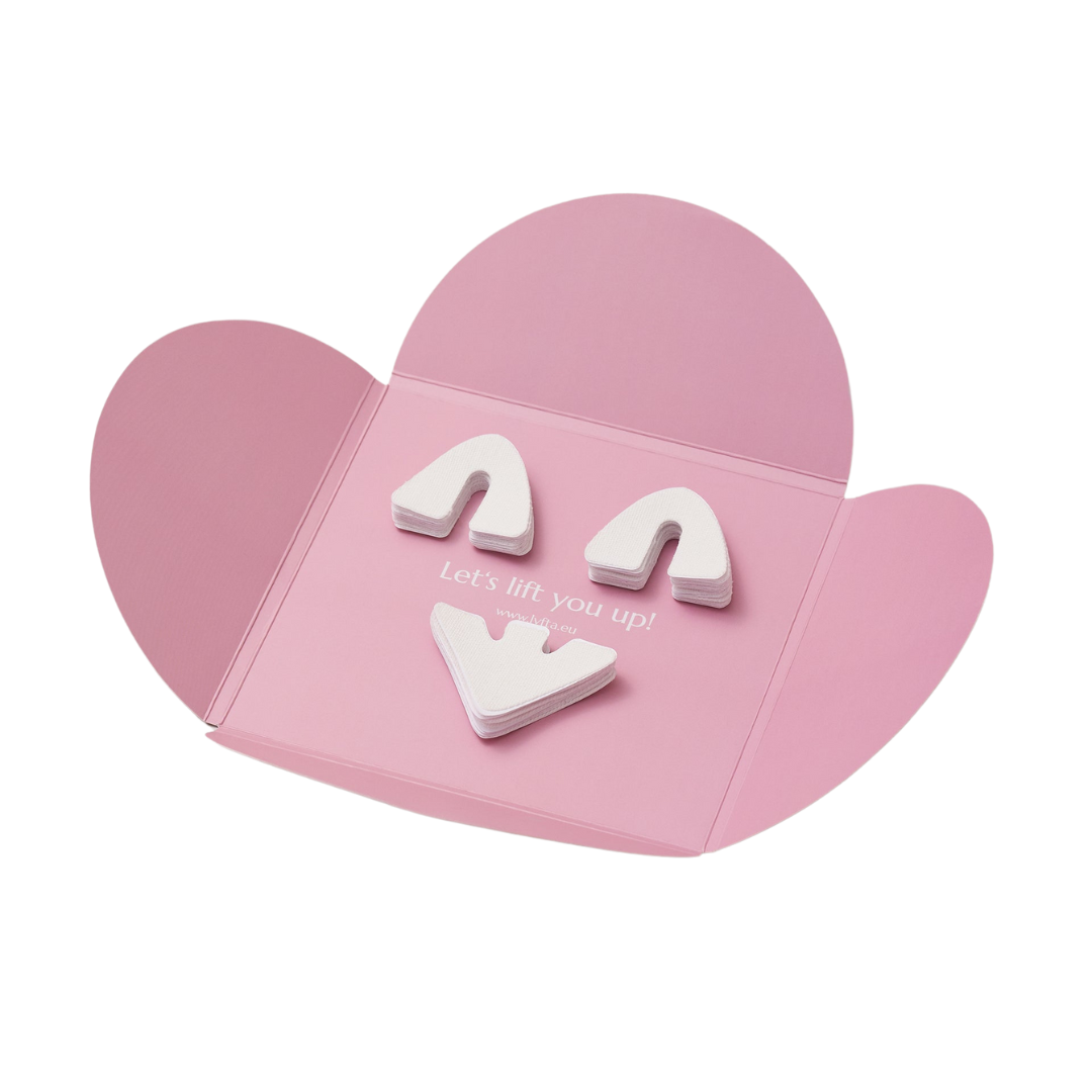 Ein Satz gebrauchsfertiger Hebebänder, Entwickelt, um feine Linien und Fältchen auf Stirn und Augen zu bekämpfen. Die Pflaster helfen, die Haut zu glätten und das Auftreten von Falten zu reduzieren.