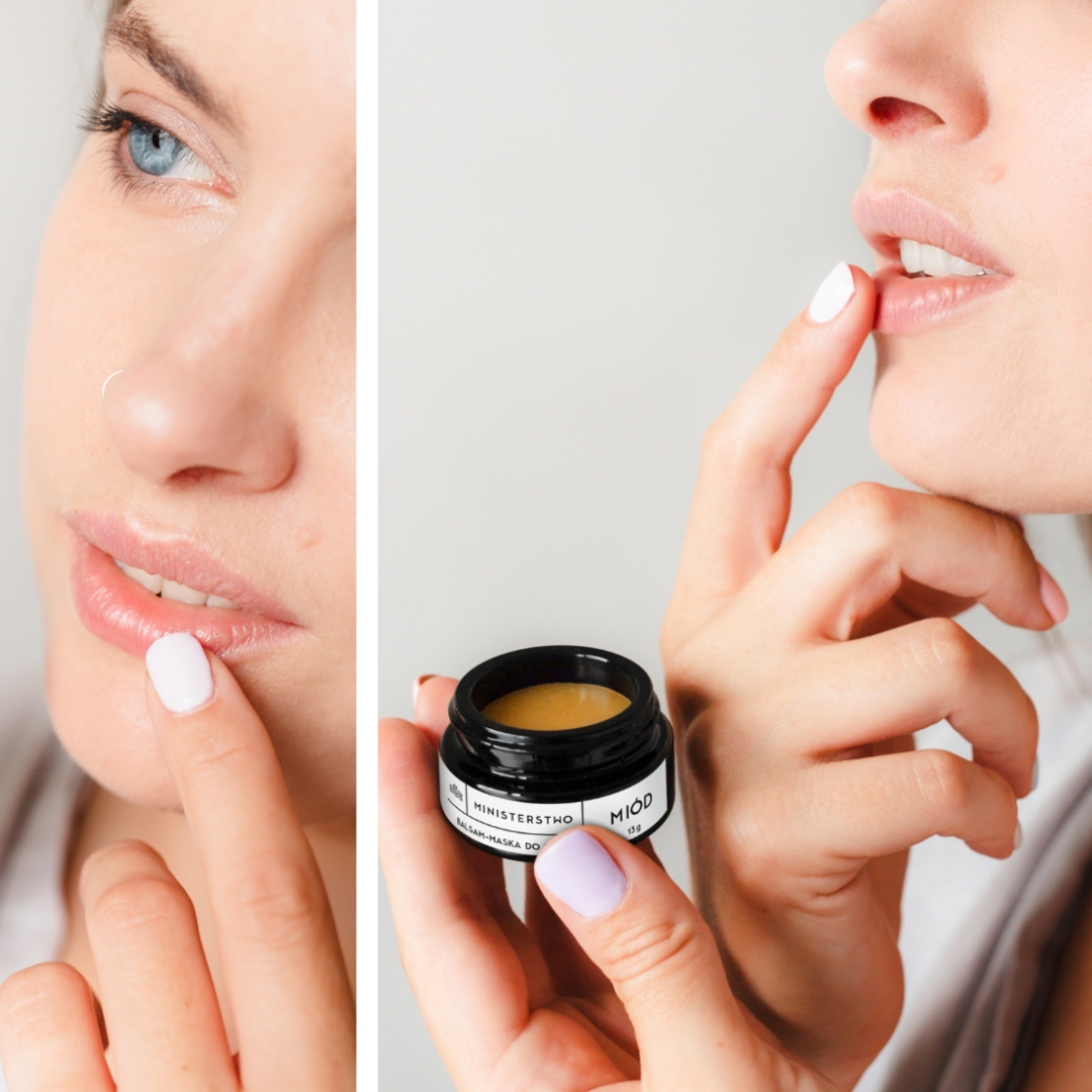 Rinse off any residue with warm water and/or wipe off with a towel/tissue, then apply lip balm to the lips.