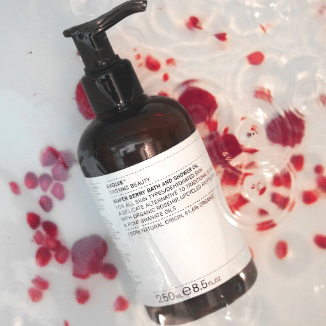 The waterless formula found in Evolve's Super Berry Bath & Shower Oil is made up of natural oil cleanses that transform into a soothing, milky emulsion that cleans the skin without disturbing its protective barrier.
