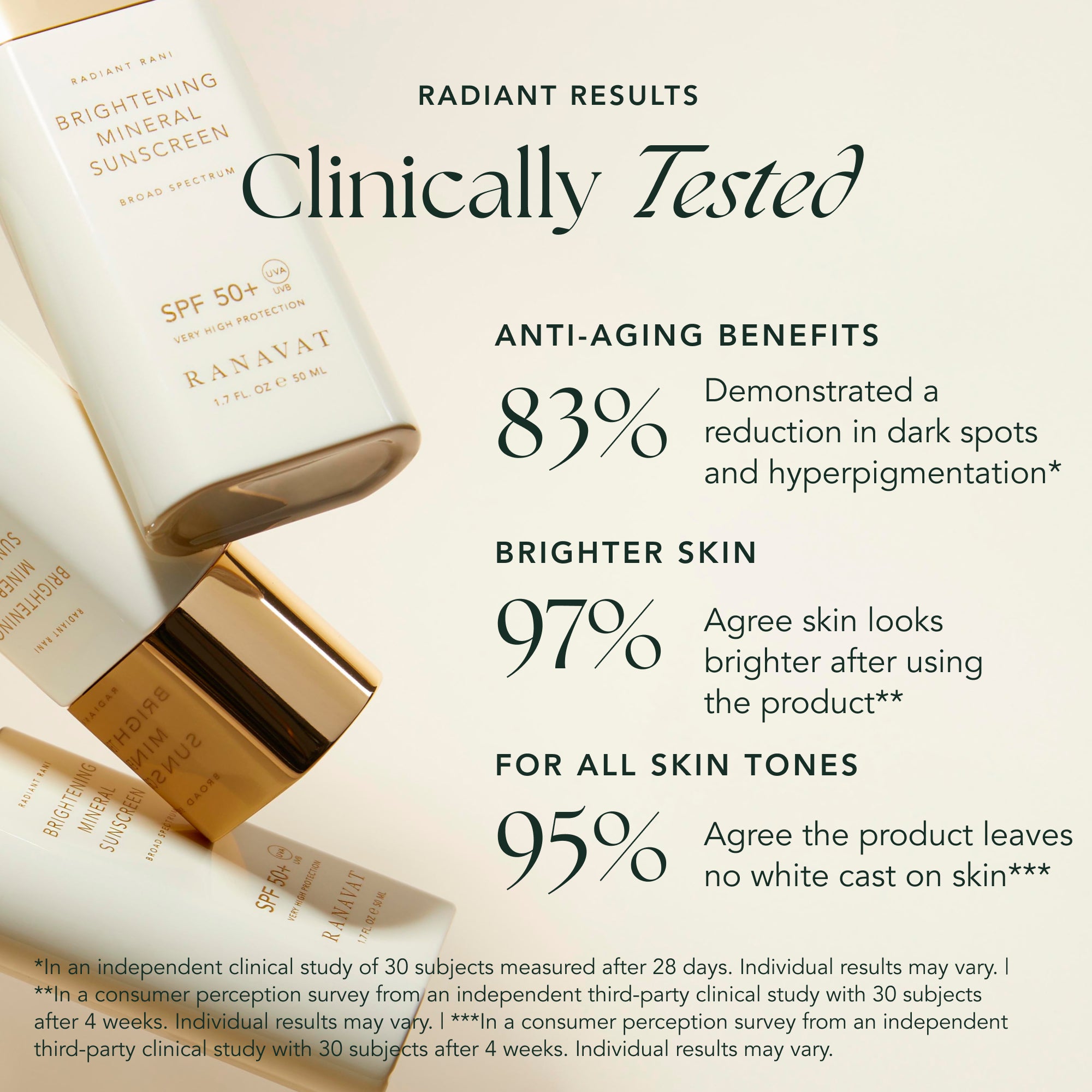 A luxurious 100% mineral SPF 50 sunscreen providing broad-spectrum protection while also brightening dark spots and reducing fine lines and wrinkles.