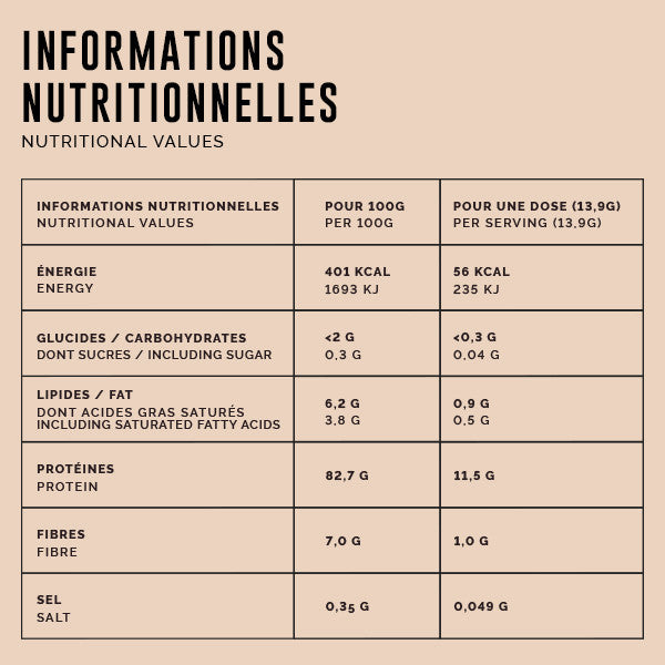 INCI : Ingrédients (pour une dose 13,9 g) : collagène marin hydrolysé (poisson) (10 g), poudre de graine de cacao (Theobroma cacao) (3,54 g), extrait sec de graine de guarana (Paullinia cupana Kunth) (222 mg) (contient 17,8 mg de caféine), extrait de fruit d’acérola (Malpighia glabra L.) (90 mg) titré en vitamine C (12 mg) (soit 15% des AR), arôme naturel, D-biotine (vitamine B8) (7,5 µg) (soit 15% des AR).