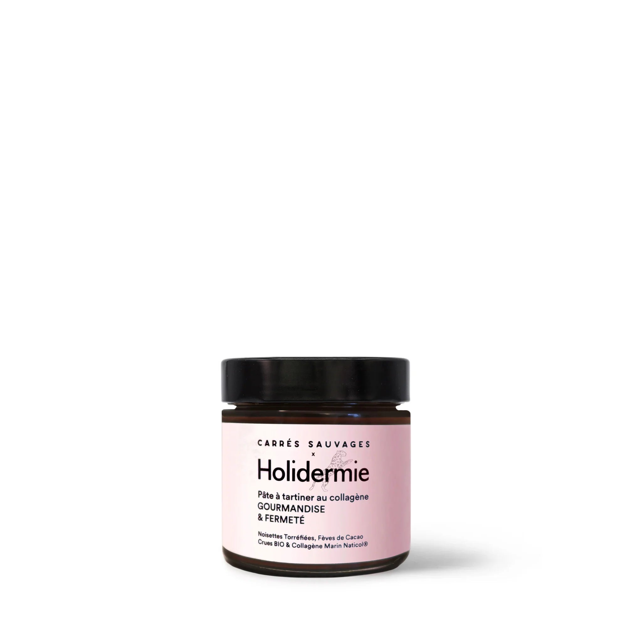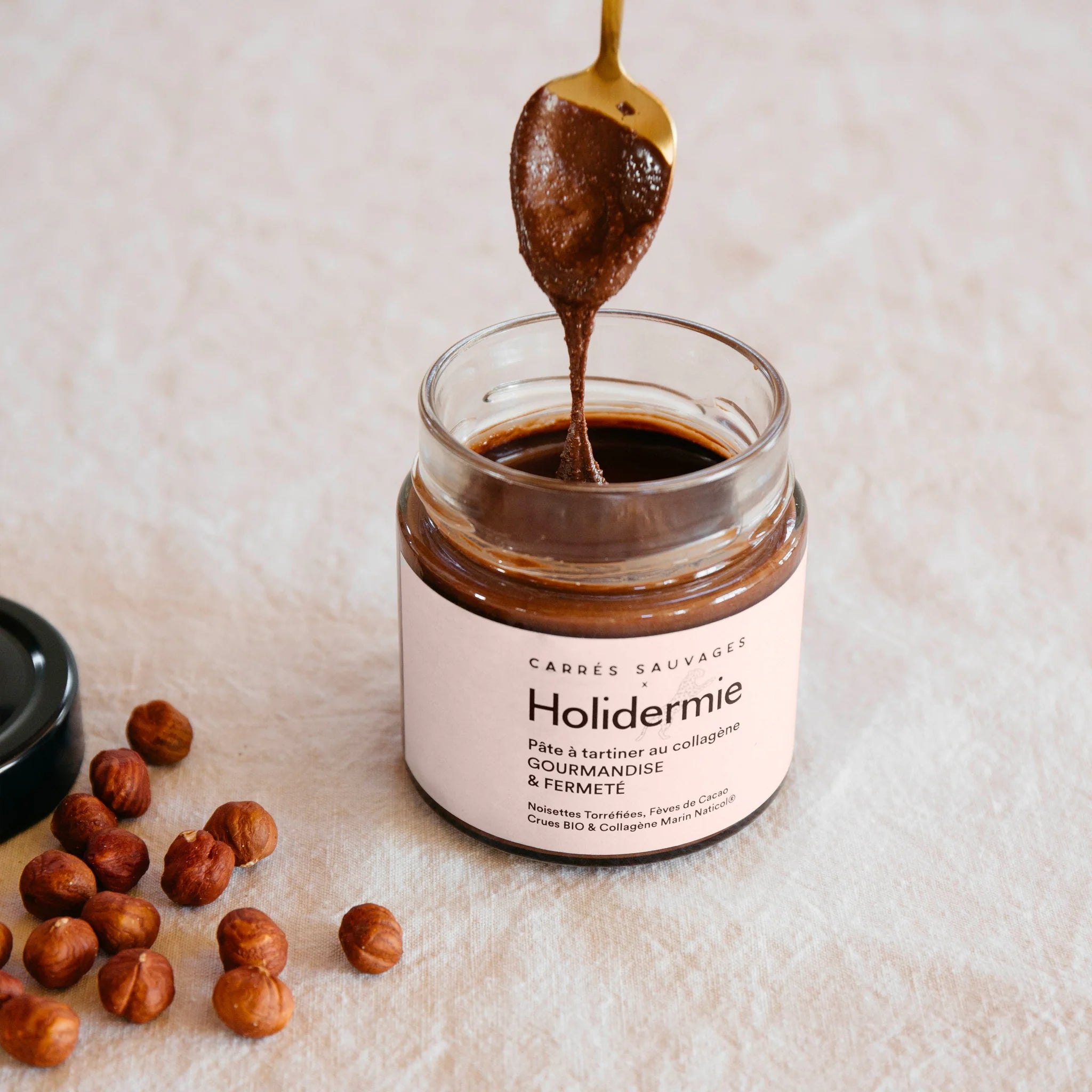 Ingrédients :  54% Noisettes du Piémont torréfiés, 15% Collagène Naticol, 14,75% sucre de fleur de coco, 10% huile d'olive*, 6% Fèves de